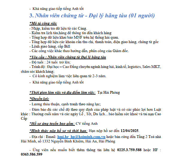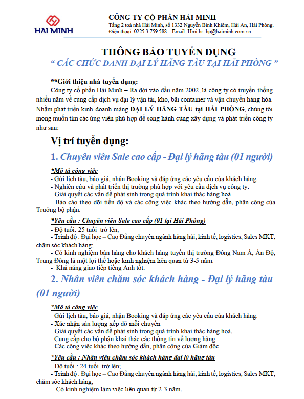 Thông báo tuyển dụng - Các chức danh Đại lý hãng tàu tại Hải Phòng