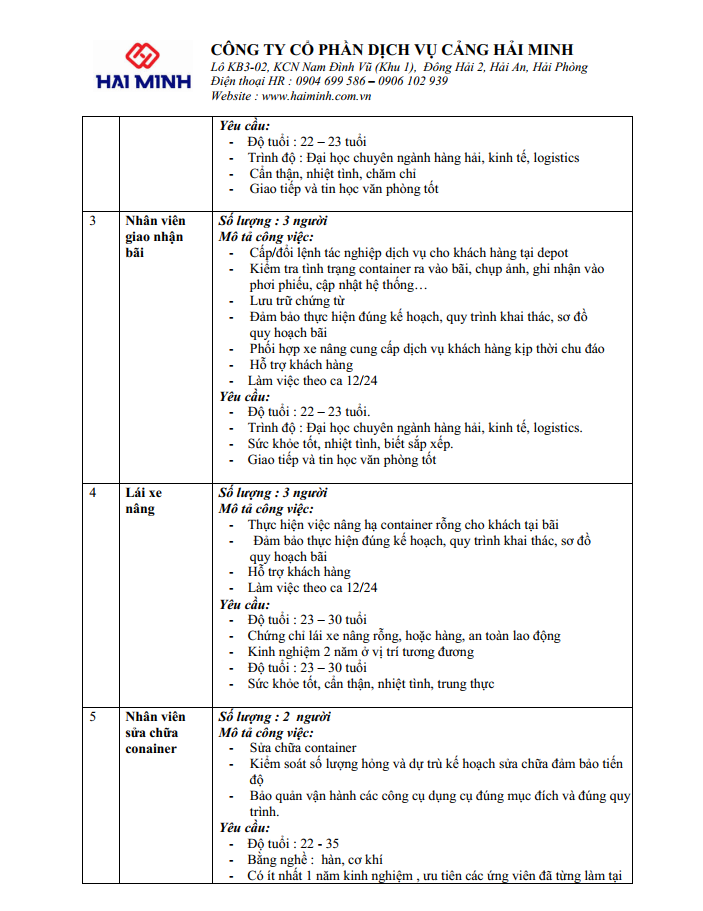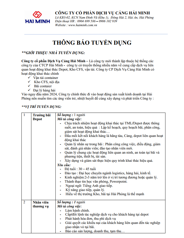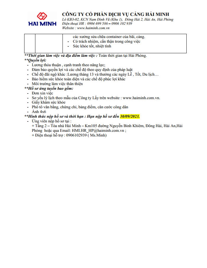 Công ty Cổ phần Dịch vụ Cảng Hải Minh - Thông báo Tuyển dụng Tháng 9/2023
