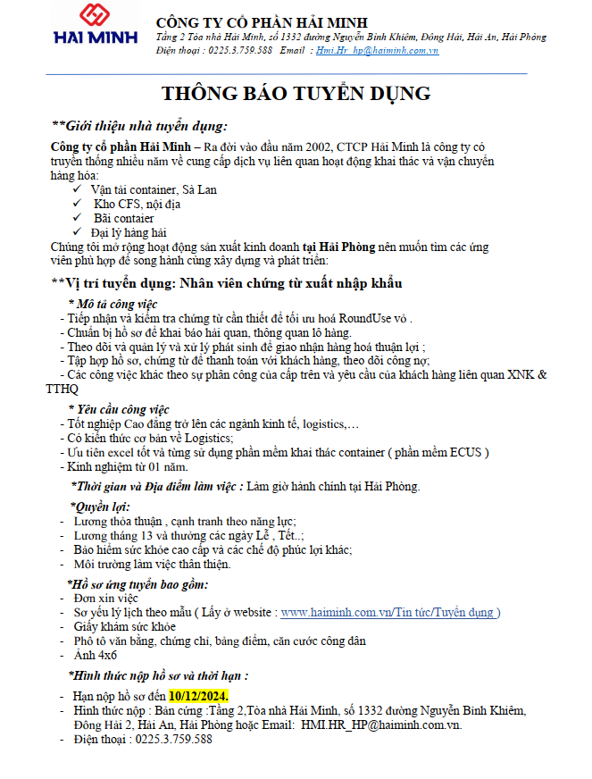 Thông báo tuyển dụng - Nhân viên chứng từ xuất nhập khẩu - Tháng 11/2024