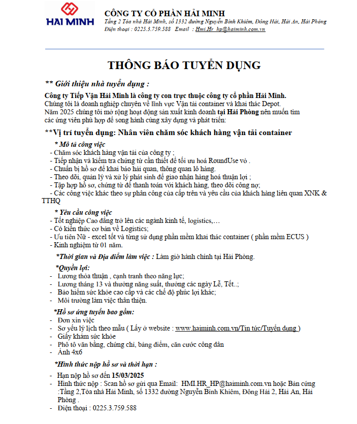 Thông báo tuyển dụng - Nhân viên chăm sóc khách hàng vận tải Container - Tháng 3/2025