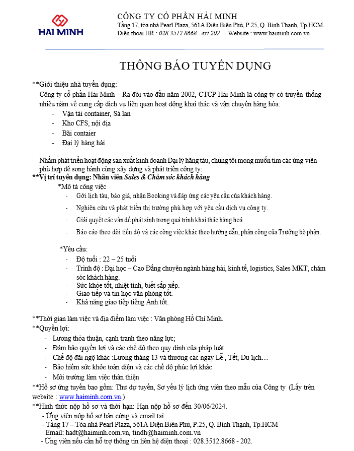 Thông báo tuyển dụng - Nhân viên Sales và Chăm sóc khách hàng - Tháng 6/2024