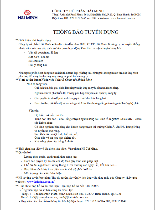 Thông báo tuyển dụng - Nhân viên Sales và Chăm sóc khách hàng - Tháng 1/2025