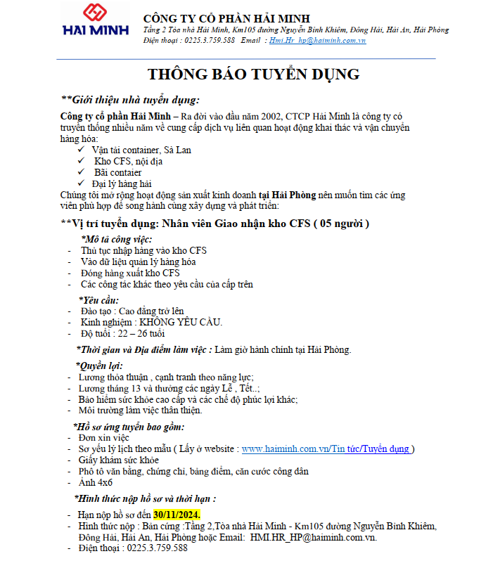Thông báo tuyển dụng - Nhân viên giao nhận Kho CFS (05 người) - Tháng 11/2024