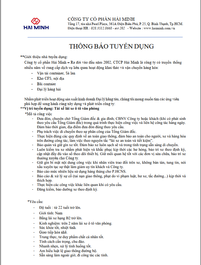 Thông báo tuyển dụng - Tài xế lái xe Văn phòng - Tháng 1/2025