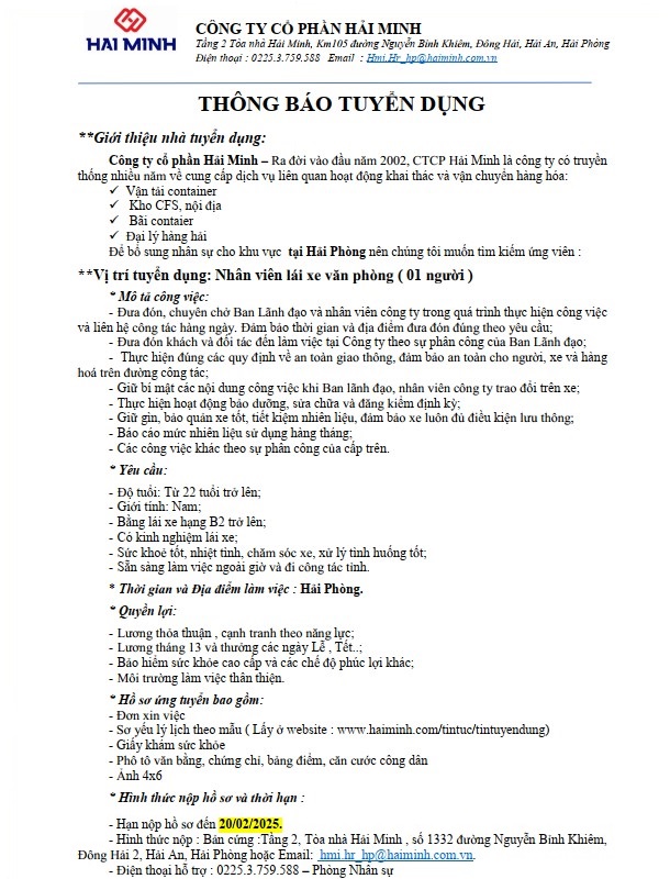 Thông báo tuyển dung - Tài xế lái xe Văn phòng - Khu vực Hải Phòng - Tháng 1/2025