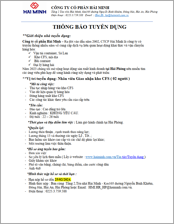 Tuyển dụng - Nhân viên Giao nhận Kho CFS (02 người)- Tháng 9/2025