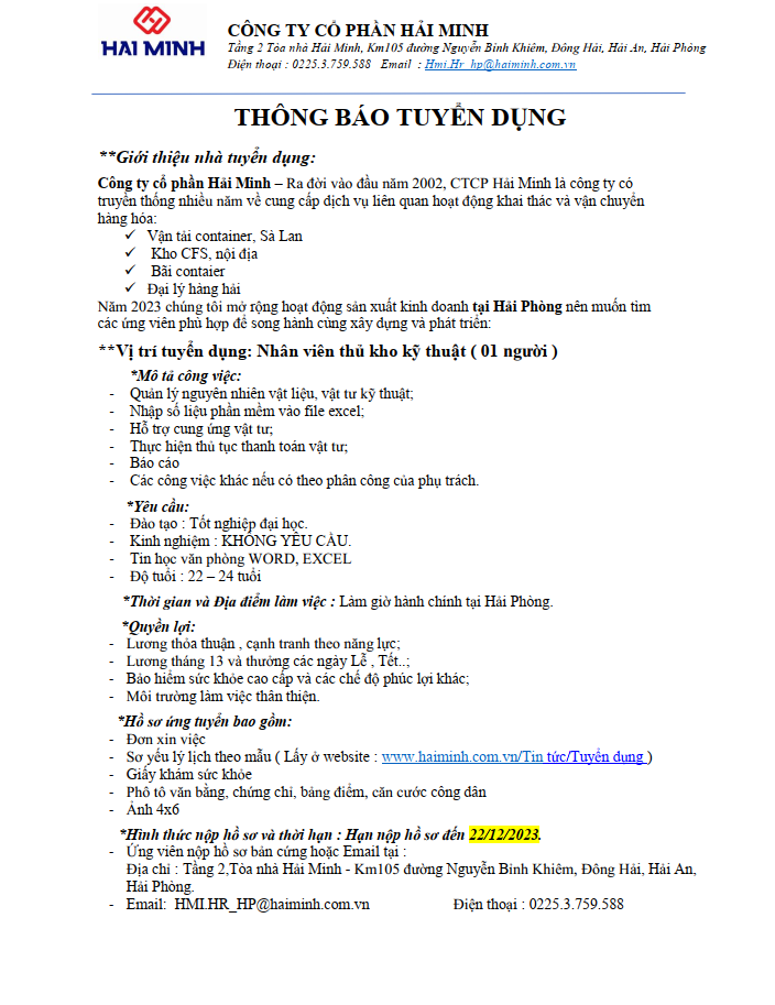Thông báo Tuyển dụng - Nhân viên thủ kho Kỹ thuật - 18/12/2023