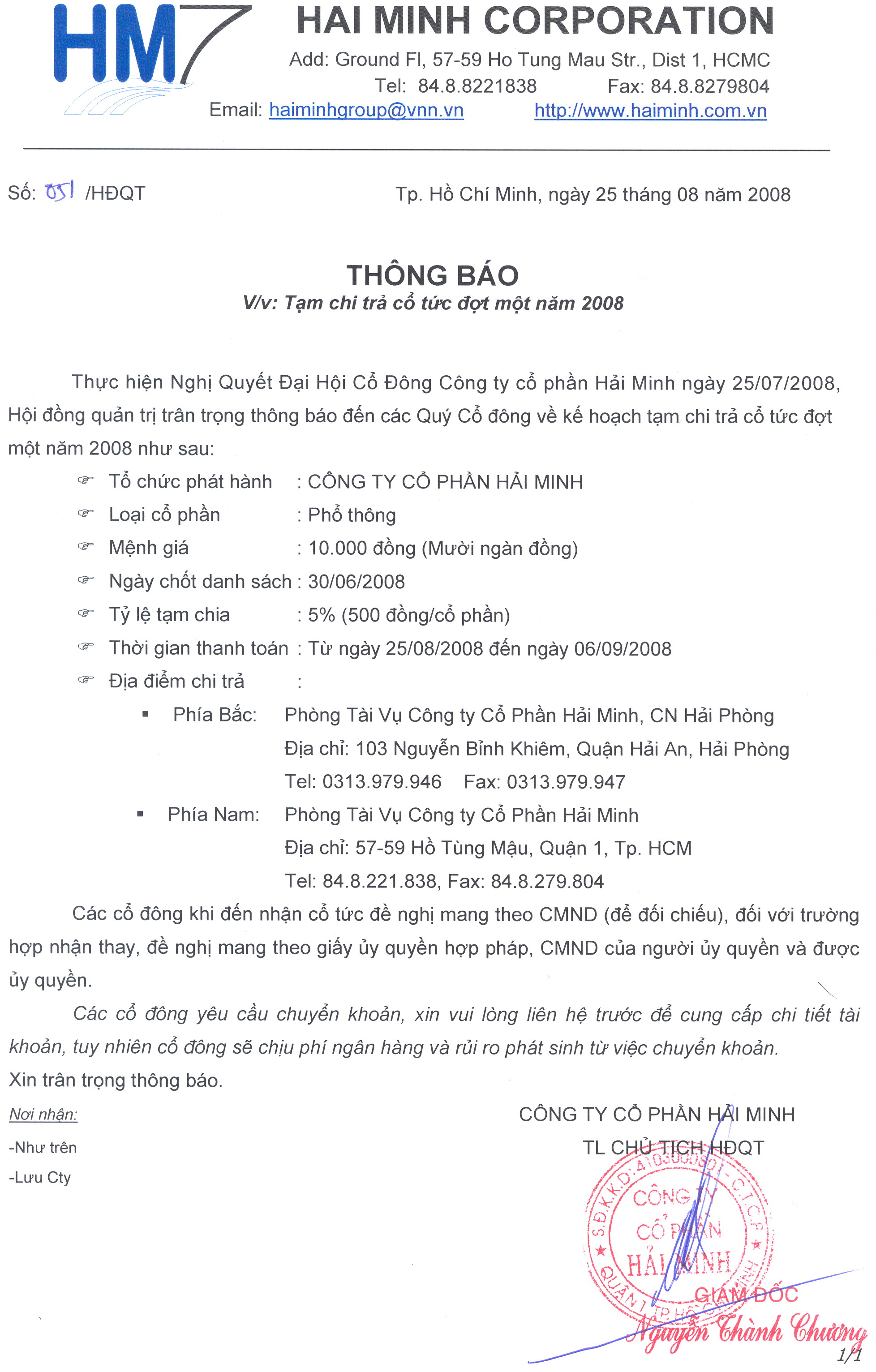 Thông báo chi cổ tức đợt I/2008