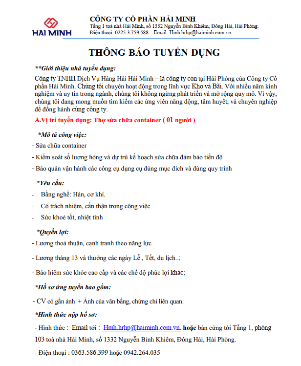 Tuyển dụng - Thợ sửa chữa Container - Tháng 4/2026